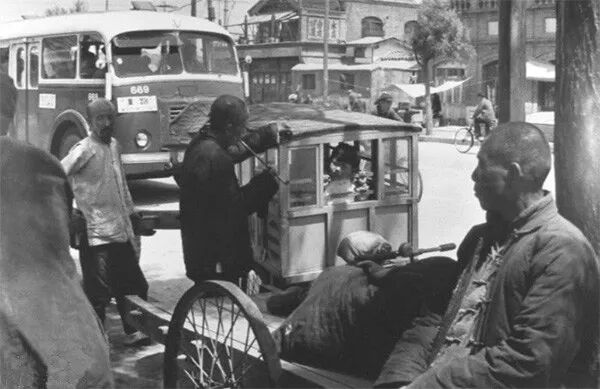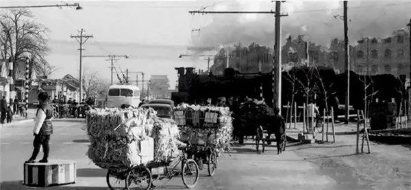 1953年,西安门大街西口(西四丁字街)西向。记得画面中前面的这种车是淘粪车,时传祥们就是背着粪桶挨户淘粪,然后从后面翻到进这车的大罐里。