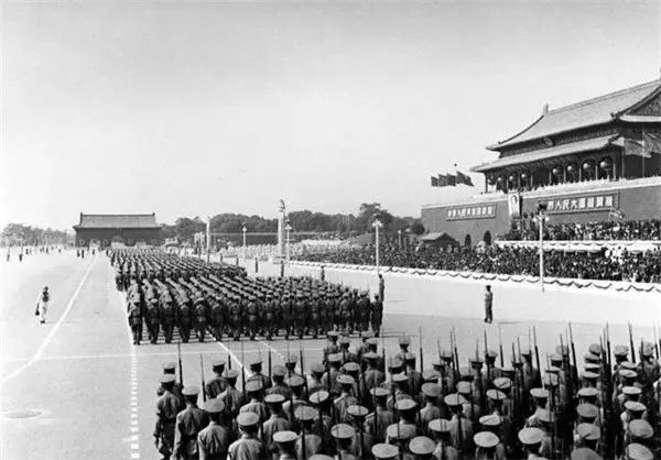 1950年,建国一周年国庆阅兵。步兵方阵通过天安门前,可见长安右门。队伍行进到长安右门要打散通过,解放军很是不爽,这埋下了日后要拆除长安左、右门的伏笔。