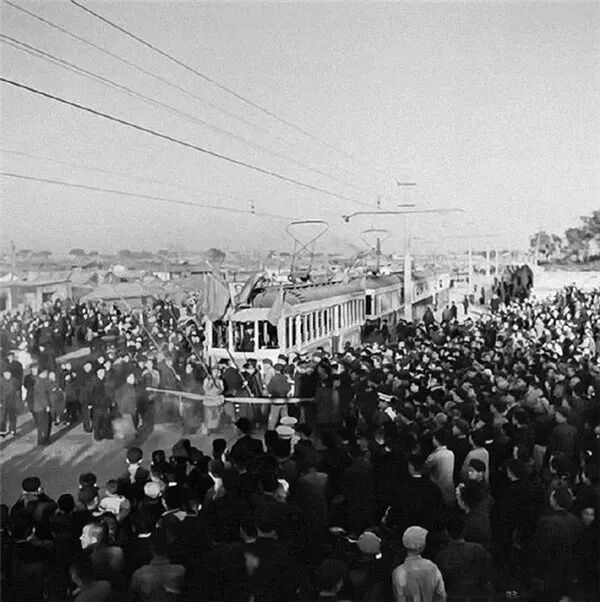 1951年,长安街天安门前。由电车公司修造厂仿制的法国100型机车及200型拖车成功,国产的有轨电车上路。