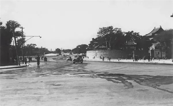 1950年,西长安街六部口路口(府右街南口)北向,可见中南海西南角的皇城墙。