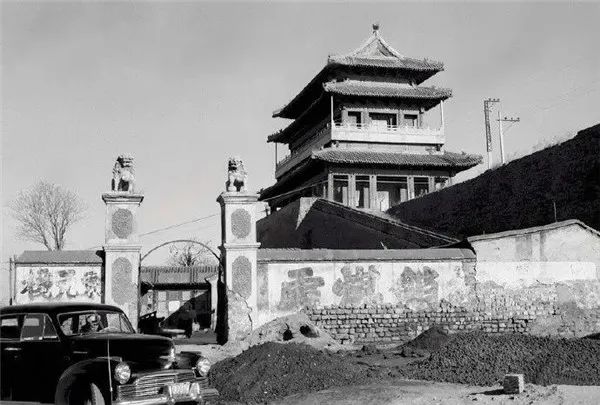 1953年,西直门城楼东面(城里),中苏蜜月期,城楼上的标语口号:“中苏两国人民的伟大的牢不可破的友谊万岁”。