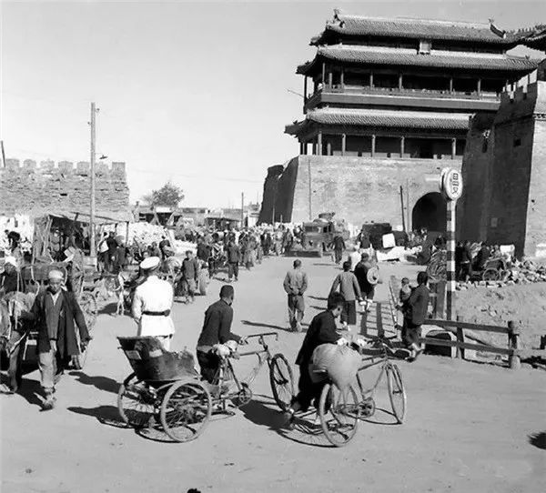 1951年,朝阳门城楼东面城门洞前,城门石匾“朝阳门”三字历历在目。赶大车,骑自行车进城送货,以及进城的行人。
