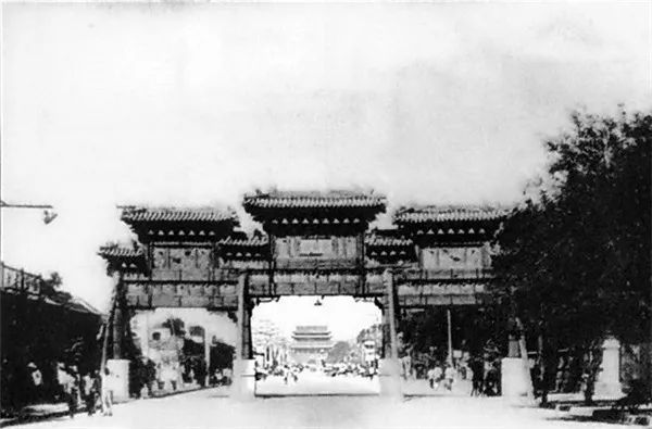 1953年,阜成门内大街历代帝王庙前“景德街”东牌楼(东向)。远处可见西四牌楼。