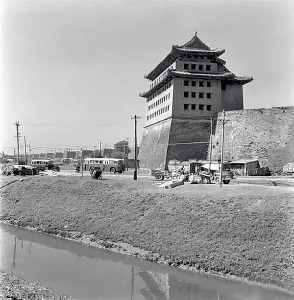 1954年,朝阳门箭楼东北面和护城河。老美的道奇大鼻子是京通线(42路,342路前身)。1951年开始进口捷克斯柯达大轿车作为北京的公共汽车,这是9路由朝阳门开往十里堡。