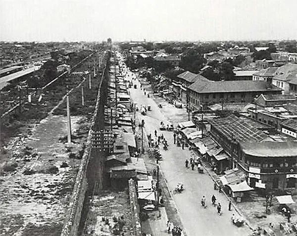 1953年,阜成门护城河桥和阜外关厢,阜成门外大街展宽前。由阜成门箭楼城台上向西拍摄。