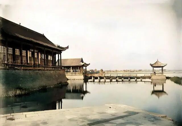二曾祠当时有两个湖心亭,东有叠波亭,西有一楼,名为广广阁。照片上是广源亭,通向凉亭的木质桥面已经腐烂倒塌。二曾祠于1970年代被拆毁,成为河南图书馆。
