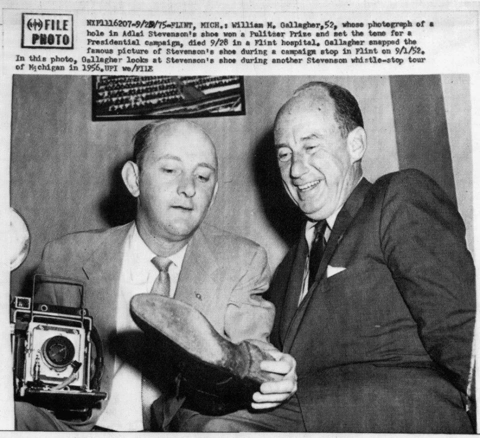 摄影师必须跪在平台的底部才能捕捉到当时的民主党总统候选人 Adlai Stevenson 的这张照片,重点在于突出他右脚鞋上的洞。在作品发布后,Stevenson 也收获到了意想不到的更多支持。