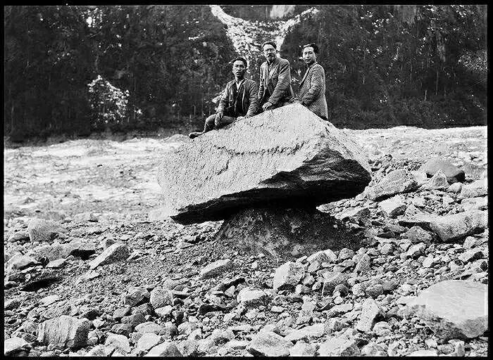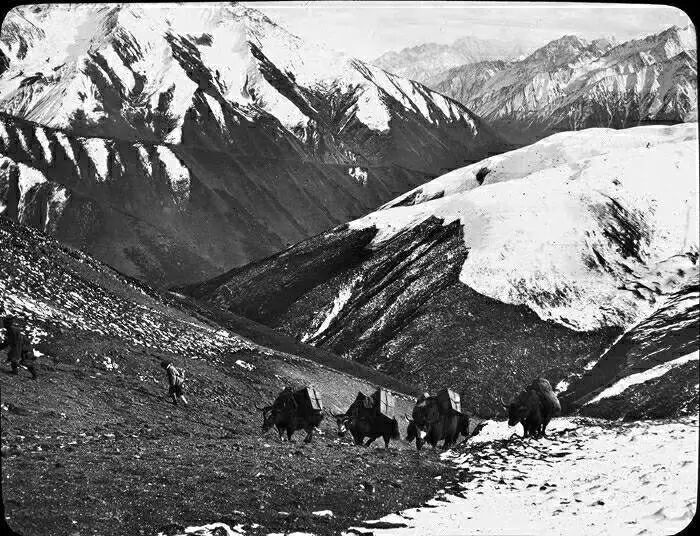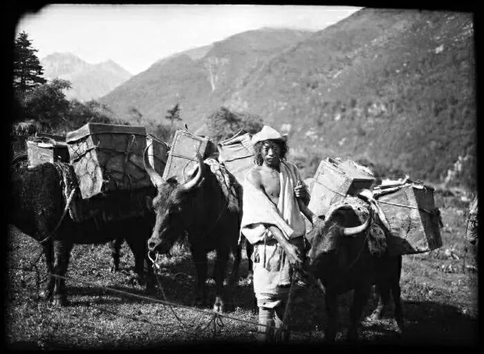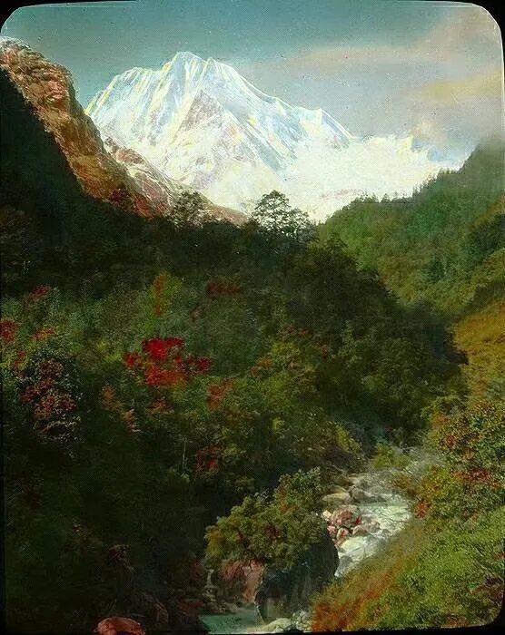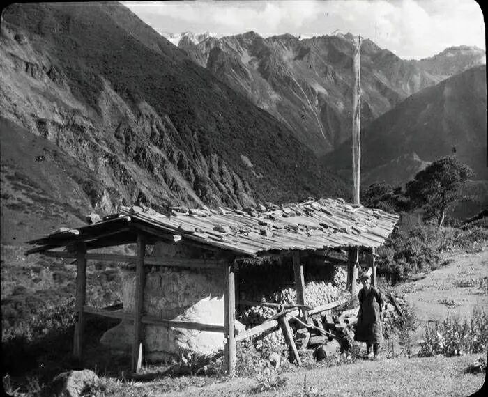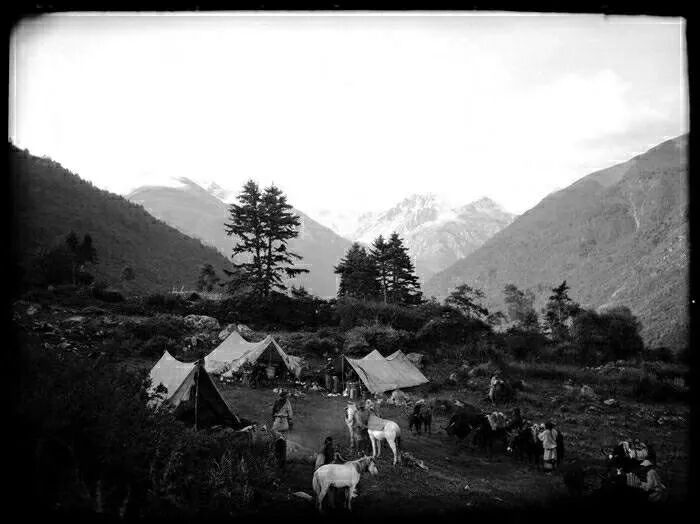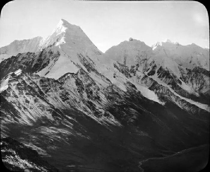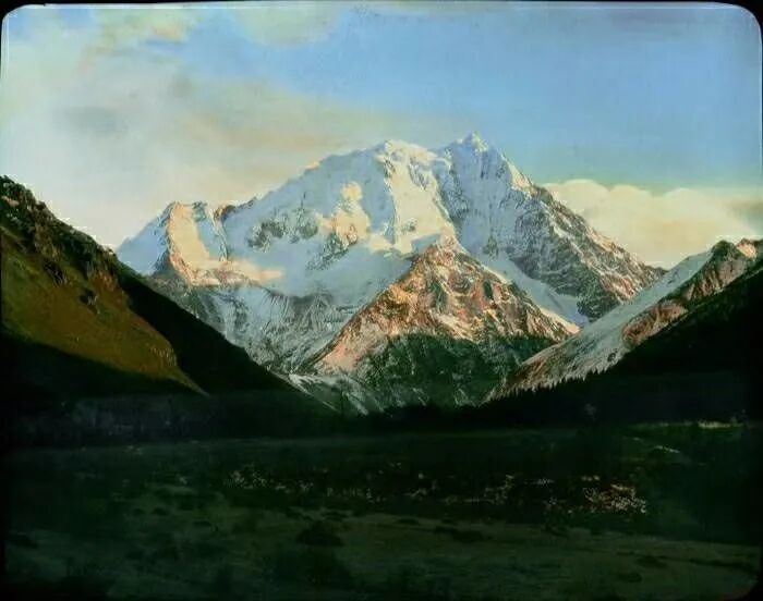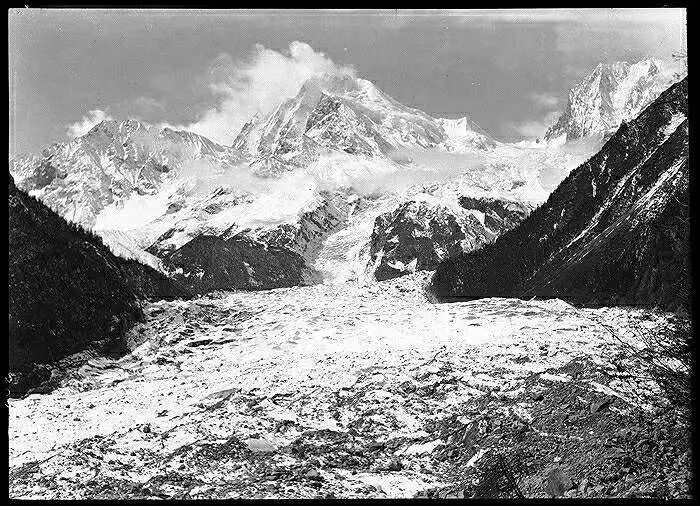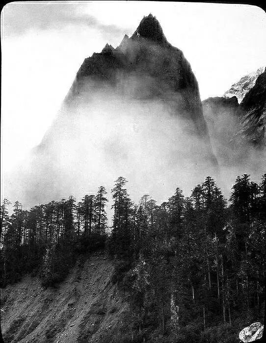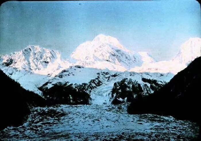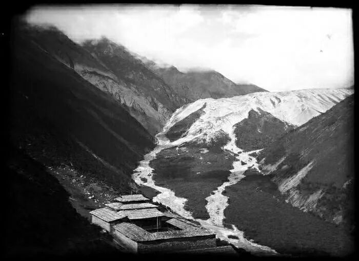 照片提供者说明:由于原照片说明为德文,又极为简单,没有标注拍摄的时间和详细的说明,更没有详尽的有关本次考察的参考资料,只能分析判断拍摄于贡嘎山、贡嘎寺及海螺沟沿途。无法提供准确的拍摄地点。其中彩色照片是人工涂色后制作的幻灯片。