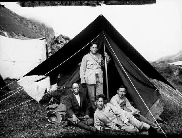 中山大学考察队一行在露宿地帐篷前的合影,海姆、李承三、徐瑞麟、古力齐等,中间站立者是阿诺德-海姆博士。