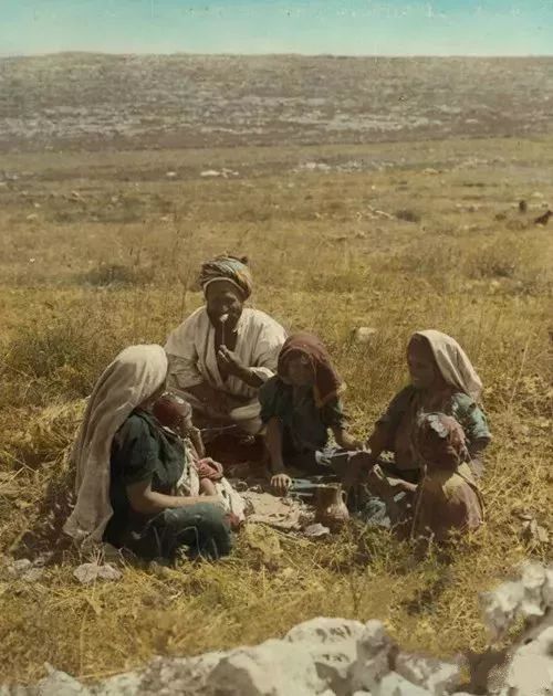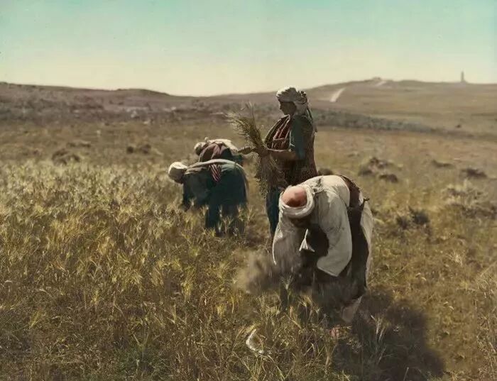 1919年巴勒斯坦地区的阿拉伯人在收割大麦。1920年英国以约旦河为界,把巴勒斯坦分为东西两部分,东部称外约旦,西部仍叫巴勒斯坦。这组照片是老巴勒斯坦地区上色老照片。