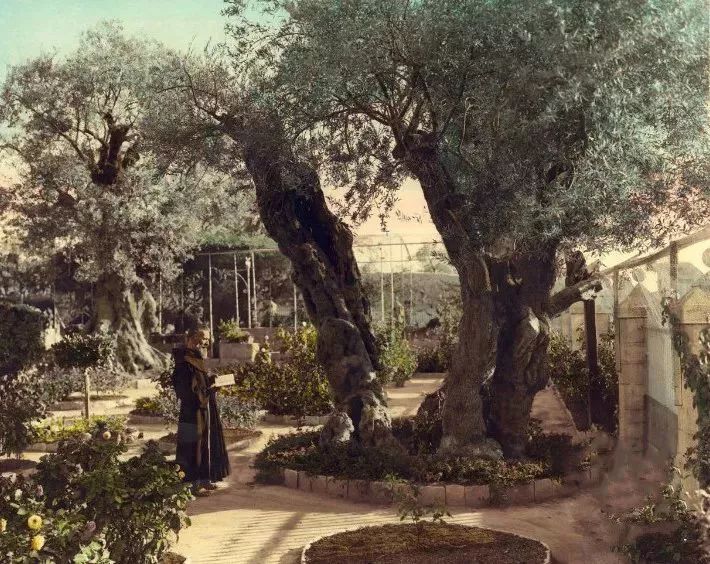 耶路撒冷的一个美丽的花园内,这好像是天主教神甫。