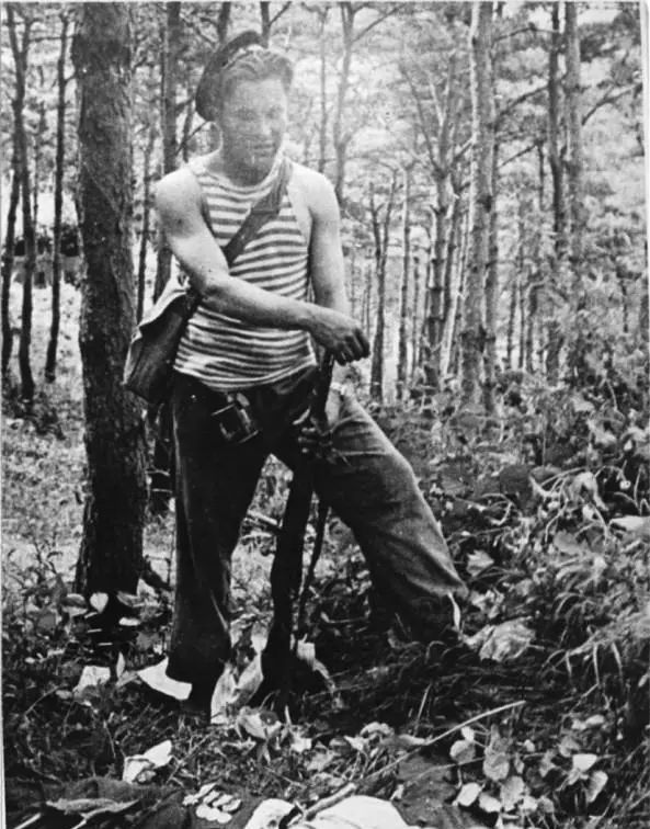 太平洋舰队的一名水手,在库页岛岛的一片森林中,身旁就是一名日本士兵的尸体。
