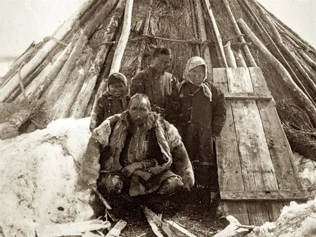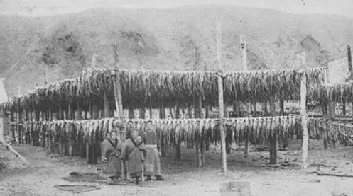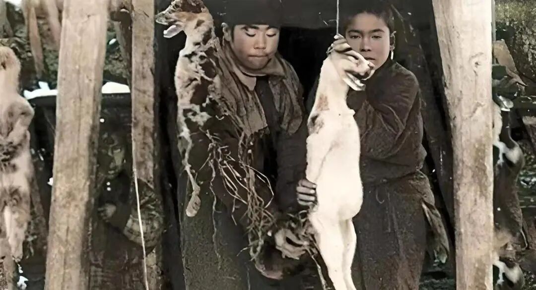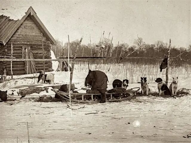 库页岛上的居民正在悬挂捕获的猎物,因为岛上的居民都是以捕鱼和打猎为生,所以他们的食物来源主要是各种野生动物。