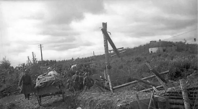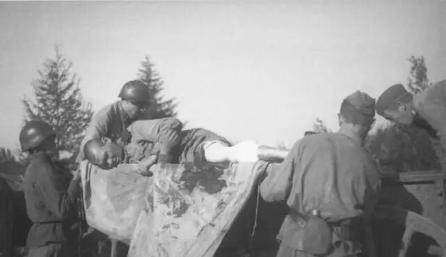 医务人员将一名受伤的士兵放在一辆马车上,运往野战医院。