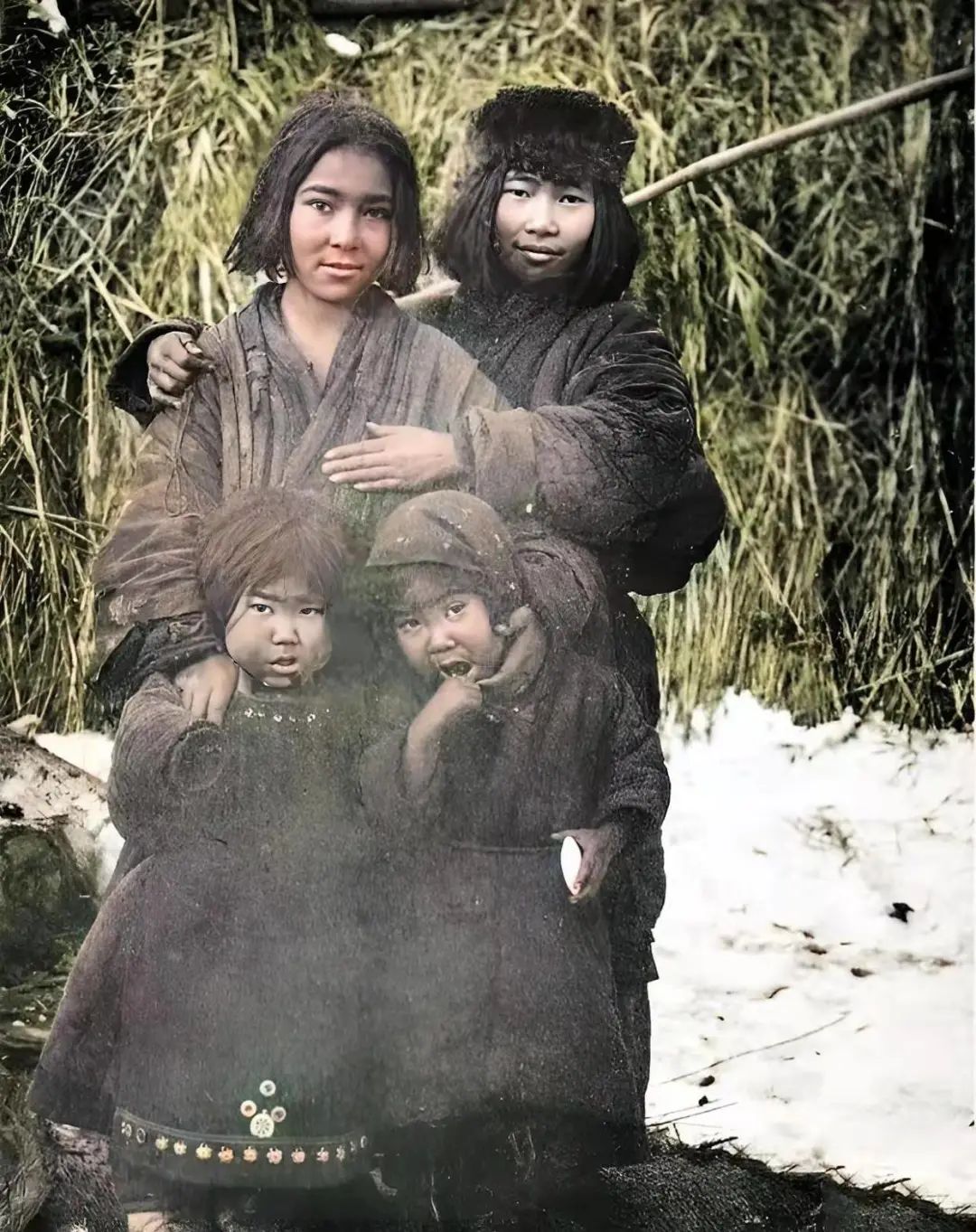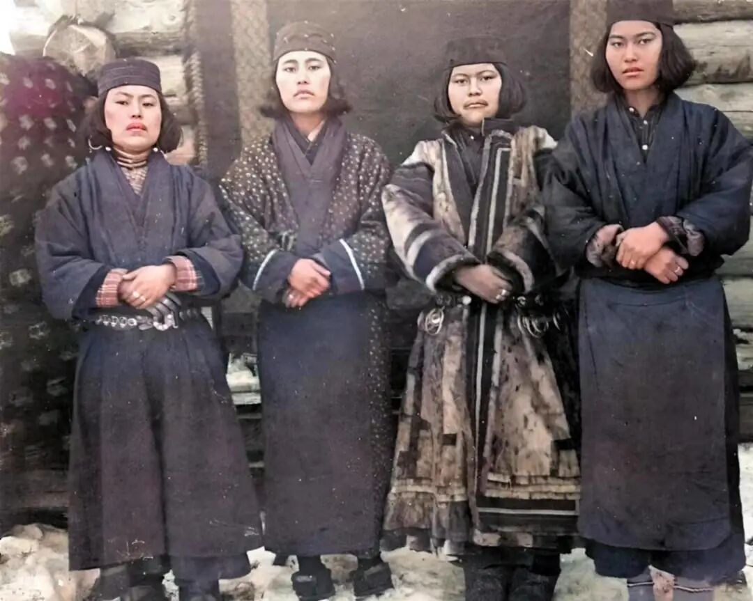 四位女子是生活在库页岛上的原住民,库页岛上的早期居民有费雅喀族(尼夫赫族)、赫哲族、阿伊努族等。这几个人似是阿伊努族,其服饰与日本人的相似。阿伊努族是从日本靠近库页岛的北方各岛屿迁徙而来。