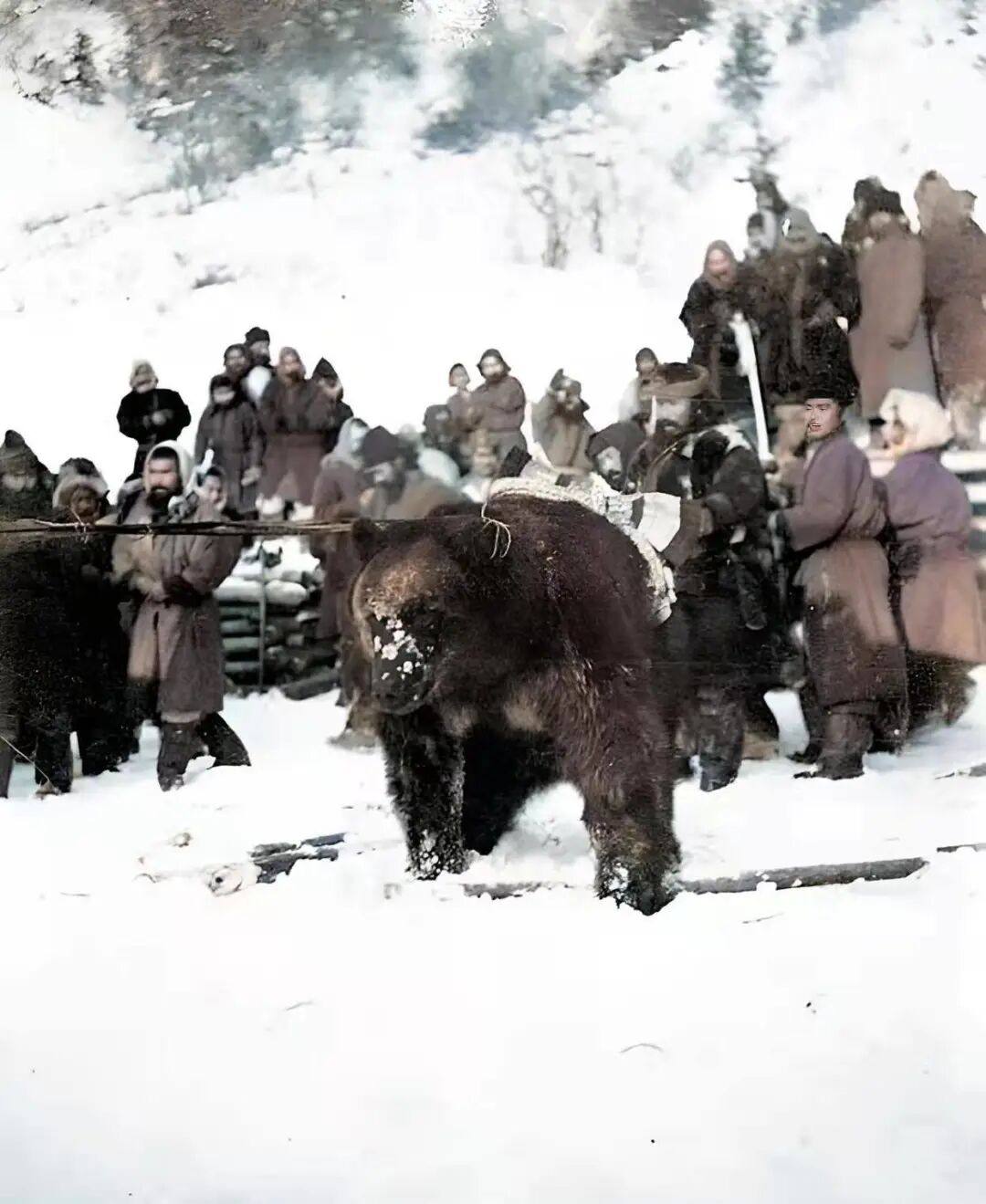 正在进行熊灵祭的阿伊努人,阿伊努人认为杀死熊是为了让它们能更好地接近神明,所以他们会将熊杀死后,再将熊的头砍下来祭拜,熊的身体会被阿伊努人吃掉,皮毛会被拿去售卖。