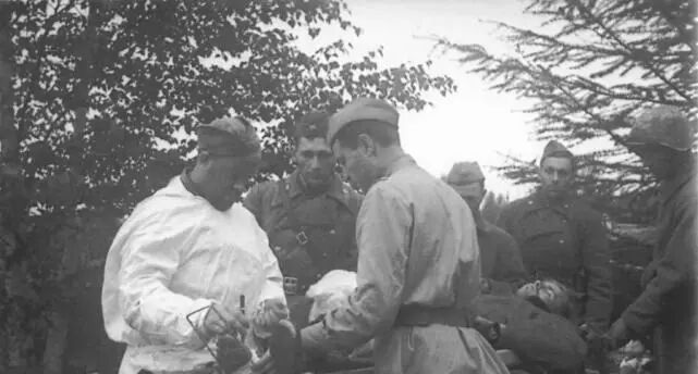 在南库页岛的进攻行动中,苏联军医为一名受伤的士兵做手术。
