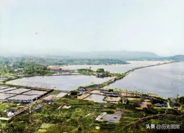 这是一幅杭州百年前的西湖鸟瞰图。烟波浩渺的西湖,青山如黛,水天一色。一栋栋江南建筑掩映在绿树丛中。照片中最显眼的就是苏堤。对比如今的西湖,让人觉得古时候的西湖别有一番韵味。