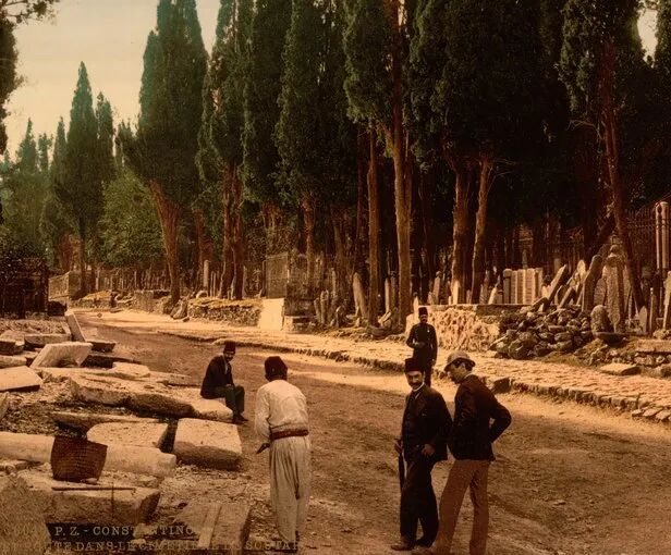 君士坦丁堡斯库台翠柏掩映下的墓地道路。