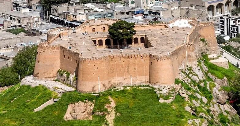 城堡位于山顶,由一系列由泥砖和棕榈木制成的三道同心墙组成,外墙围绕着旧城。堡位于古城区的最高点,最高处里地貌约60米,面积约为18万平方米,高约12米,墙高2至7米,长达1815米,曾经有一条护城河环绕,城堡建于萨珊王朝(公元224—651年),距今已有2000多年的历史。2004年被联合国教科文组织列为世界文化遗产。