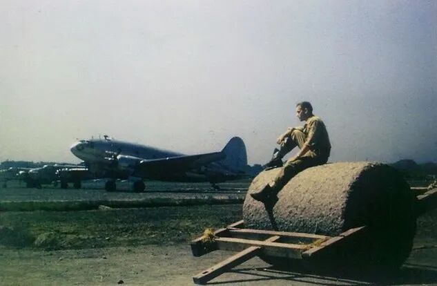 重庆白市驿机场,坐在石碾上的William L. Dibble