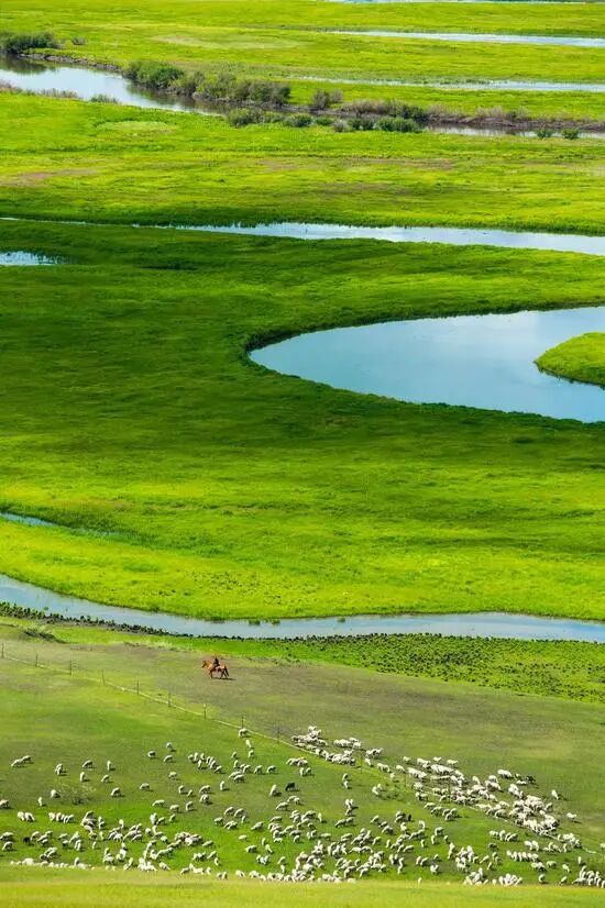 这里有灿烂的阳光和苍茫的天空,蓝天白云低垂在一眼望不到边的草原,这里有安静的赛里木湖,五色的花海,翠绿辽阔的草原牧场,美好的一切,这里都包含了。