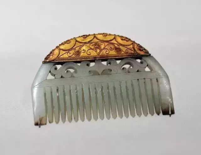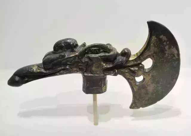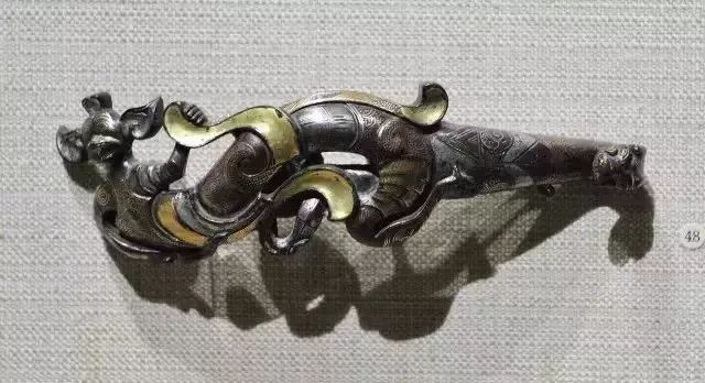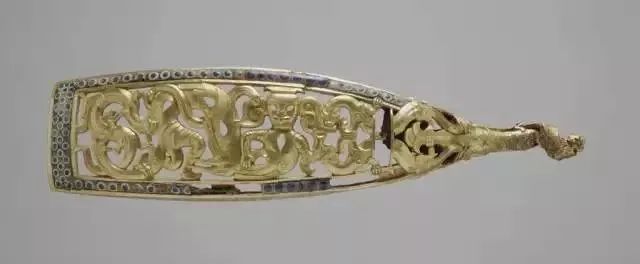 ▲镶嵌珍珠、绿宋石和玉璜的镀金带钩 战国时期 长16.5cm