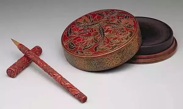 ▲清 嘉庆 卢葵生填金盖漆砂砚与剔红笔 3.5 x 12.22 cm