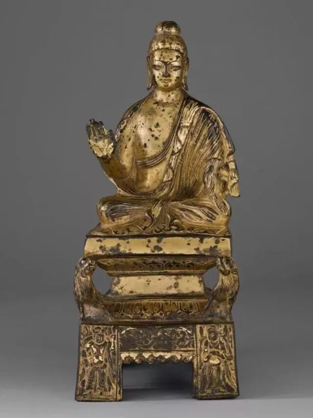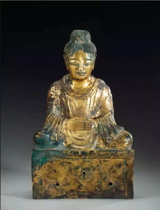 ▲铜镀金坐佛像 后赵,公元338年 高40厘米,宽24.1厘米,厚13.3厘米