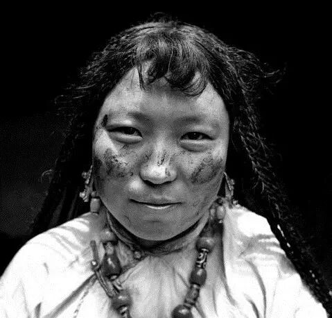 1937年摄于青海玉树。玉树藏族青年妇女有用酥油和黑灰涂面之俗。相传古时藏王因妇女容颜秀丽,为防喇嘛不能遵守清规,于是下令妇女涂面以护佛法。涂面之另一意义谓:高原朔风多历,涂之以滋润肌肤云。