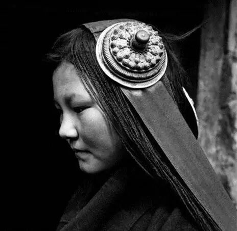 1939年摄于四川理塘。理塘牧民少女,细辫如丝,穿氆氇衣,头顶银盾二枚。