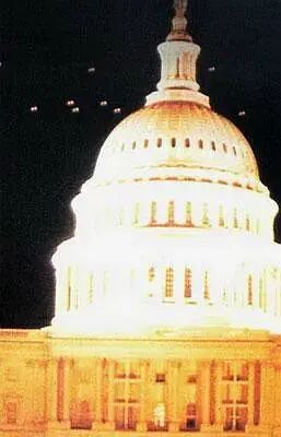 1952年,美国很多人在华盛顿看到一些UFO从美国国会大厦上空飞过,有人将这个画面拍了下来。