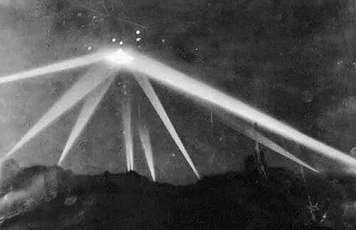 1942年2月25日,探照灯的灯光都集中在美国洛杉矶上空的一个不明飞行物上。那个明亮物体周围的亮斑,是防空炮弹爆炸产生的碎片。