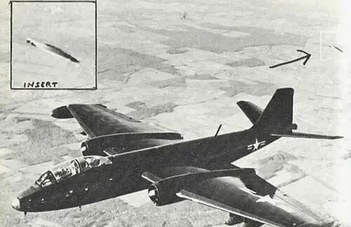 1957年9月,一名试飞员在美国加利福尼亚州爱德华兹空军基地附近拍摄到这张照片。照片显示,一个UFO在跟踪一架B-47 喷气式飞机.