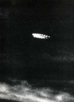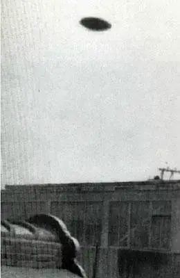 这是在日本拍摄到的众多UFO照片中的一张。这张照片显示,1958年,一个不明物体从日本福冈市上空飞过。