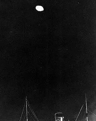 1947年,3名美国陆军航空队老兵在报告中说,他们在美国加利福尼亚州卡塔兰(Catalan)岛上空看到6个飞碟,前航空摄影师鲍勃·江表示,他成功拍摄到其中一个。在照片的最下面可以看到蒸汽船的桅杆。
