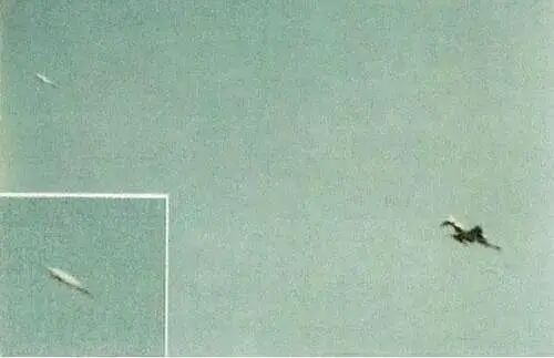 1979年9月19日,在德国上空,一个飞碟在“追赶”一架“鬼怪”战斗机。这张照片是教师卡尔・梅尔博士用宝丽莱相机拍摄的。