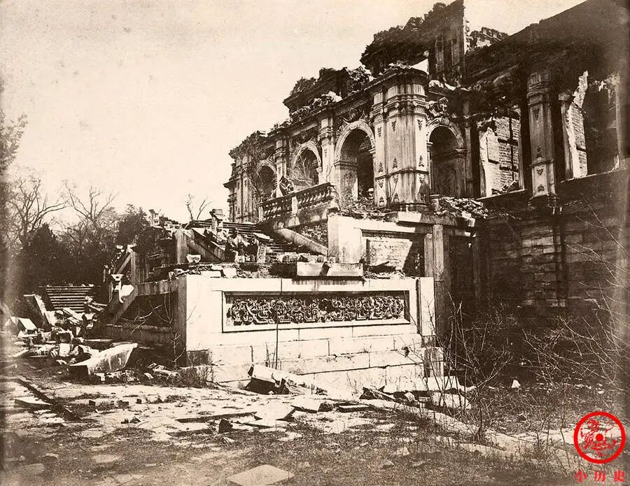 1860年,英法联军闯入圆明园,劫掠、焚毁了这座富丽堂皇的“万园之园”。查尔德到此拍照时,圆明园被毁已有10余年时间,西洋楼的主体结构依稀可辨,在以后的岁月中不断受到破坏,直至完全成为一片废墟。