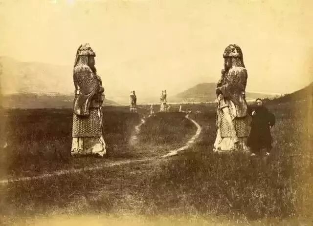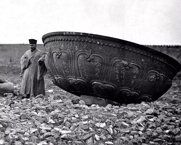 清末,南京大报恩寺遗址,一名僧侣站在被毁的大报恩寺建筑构件的旁边。约翰·汤姆逊/摄