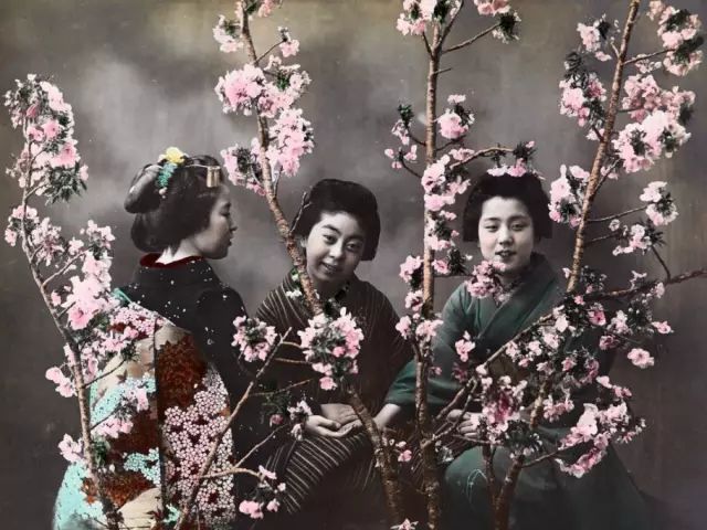 1910年代,身穿和服的日本妇女正在观赏樱花,上色彩照。
