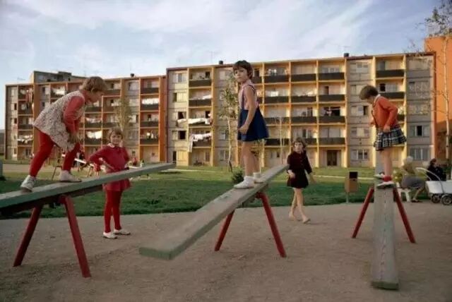 1966年,捷克,一个住宅区玩跷跷板的小女孩们。