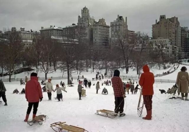 1960年,纽约中央公园,滑雪的人。
