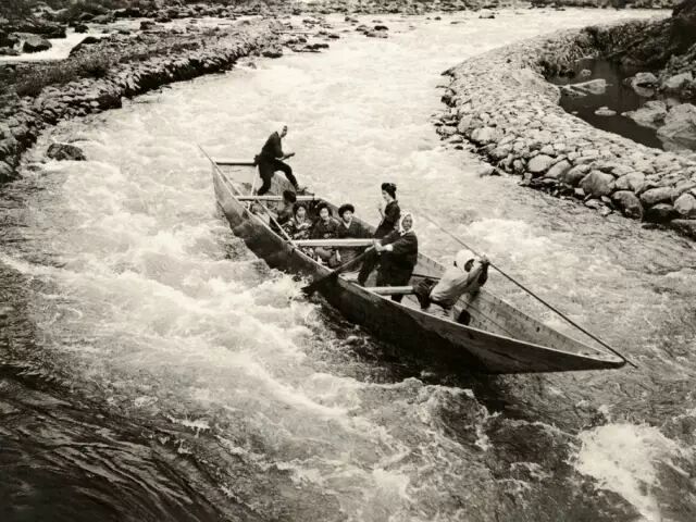 1921年,日本京都郊外,身着和服的日本女子在河中乘船游览。