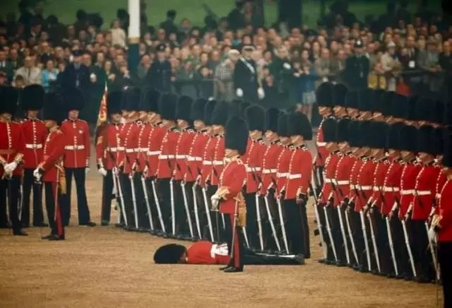 1966年,英国,一名爱尔兰卫兵在队列中眩晕跌倒。
