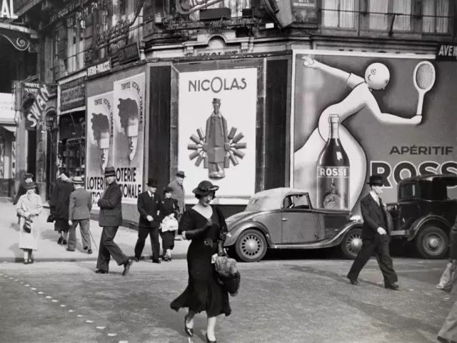 1936年.法国巴黎最时尚地区街头的行人,街道两旁林立着彩票和苦艾酒的广告。梅纳德·欧文·威廉斯/摄。