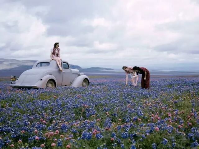 1940年代,美国加利福尼亚州的圣霍金河谷,旅行者在公路旁的原野上采野花。安东尼·斯图尔特/摄。