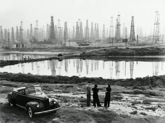 1941年,美国加利福尼亚州的斯格纳希尔,一男两女正在聊天,他们的前方是鳞次栉比的钻油塔。