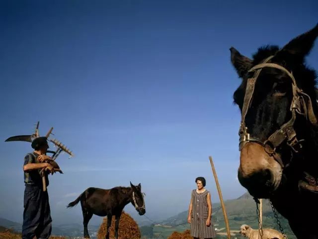 1968年,西班牙巴斯克,一对农民夫妇的驴与农具。