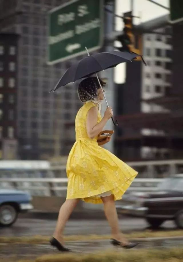 1965年,密苏里州圣路易斯市,快步行走在街上打伞的妇女。