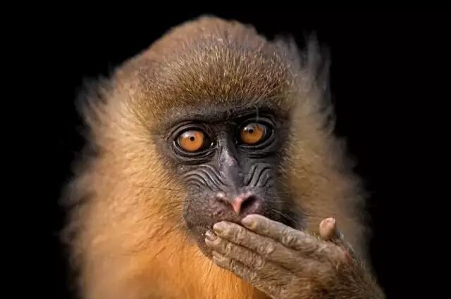 2008年,赤道几内亚首都马拉博,一只五个月大的山魈(西非洲产的大狒狒)在一个野味市场附近见到一个参观者时的反应。